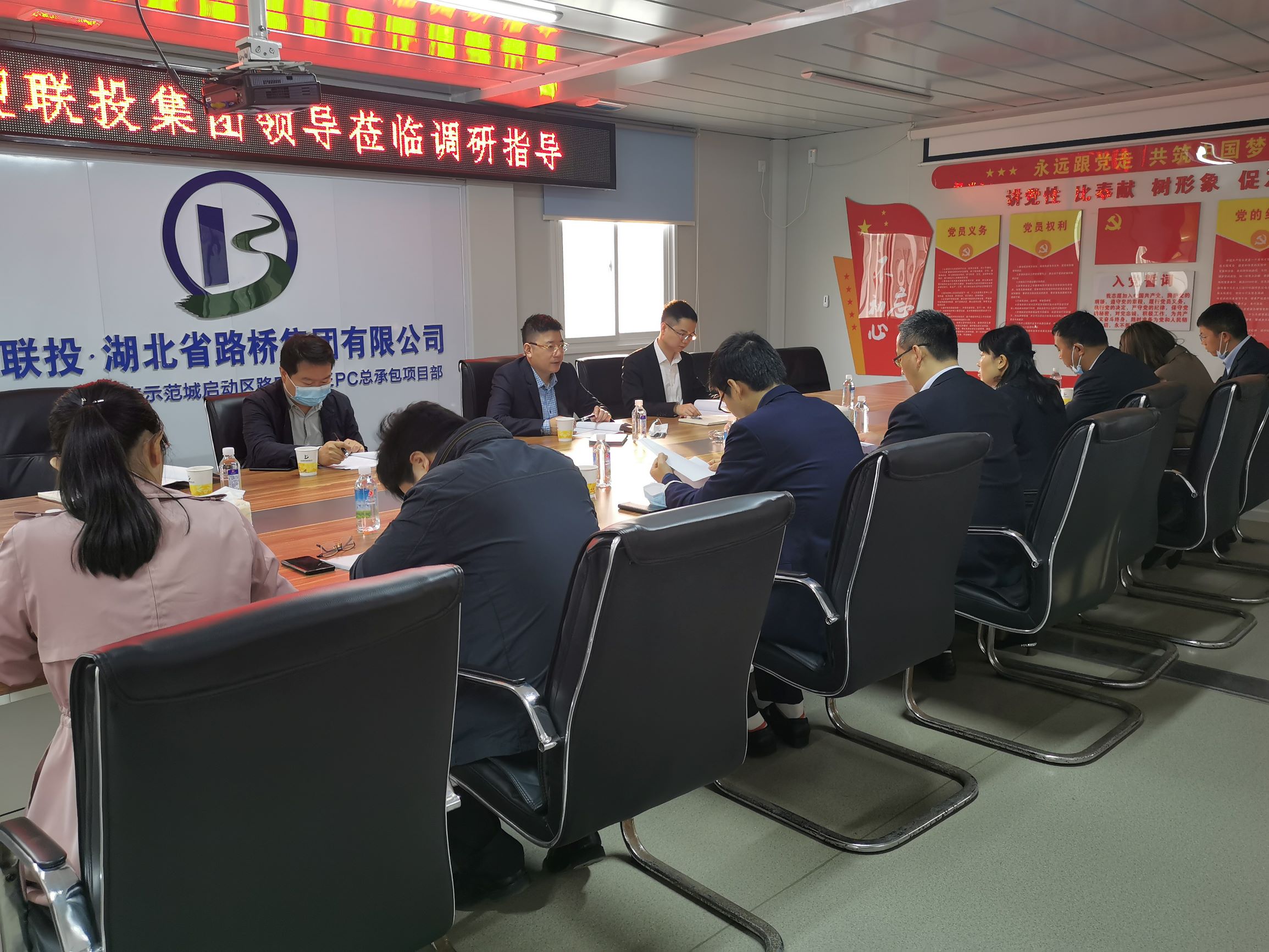 11月18日,联投集团党群工作部部长王忠浩一行到湖北路桥中法生态城项目,调研指导湖北路桥党建工作。建投集团党委书记、执行董事周俊,湖北路桥总经理助理、市政公司党支部书记刘占兵,湖北路桥纪委副书记、人力资源总监李素英等陪同座谈。