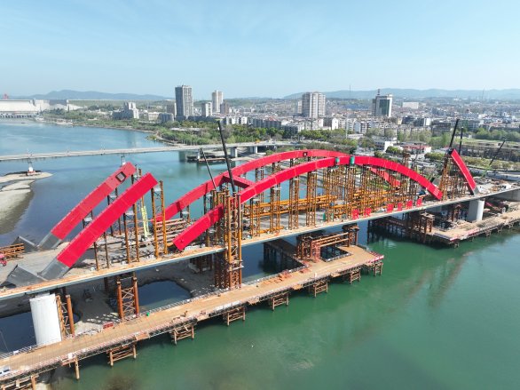 围绕丹江口水都二桥项目,湖北路桥在本次QC成果活动中重点研制了大跨径提篮式钢箱系杆拱桥钢拱肋原位拼装支架、大断面钢箱梁拼装平台及大跨径大断面钢箱梁原位拼装支架,研发了大矢跨比超高钢箱拱肋合龙方法、大坝泄洪区河床承台基坑开挖方法、水位高频变化钢管桩施工方法、水位高频变化大体积异形承台施工方法、长距离大跨度大高差钢箱梁多轮顶推方法及水位高频变化引孔钢板桩围堰施工方法,重点解决了大坝泄洪区大跨度钢箱系杆拱桥钢管桩施工、钢板桩围堰施工、承台开挖、钢箱梁拼装、多轮顶推、拱肋合龙等施工重难点问题。一系列关键核心技术的顺利研发,为水都二桥项目创优创杯工作打下坚实基础。